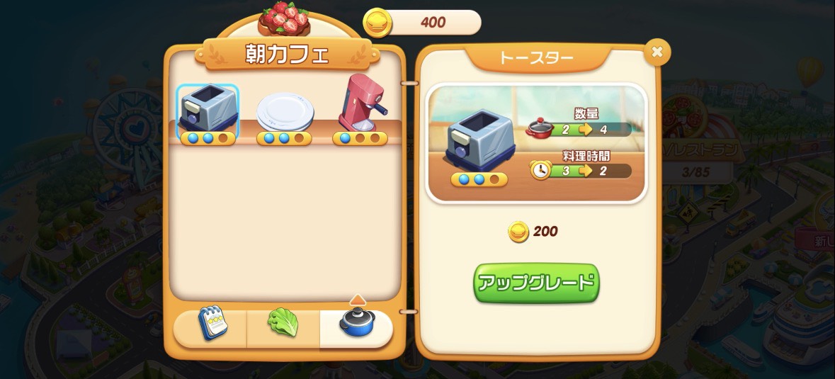 ステージで獲得したコインは、キッチン設備の強化に使えます。