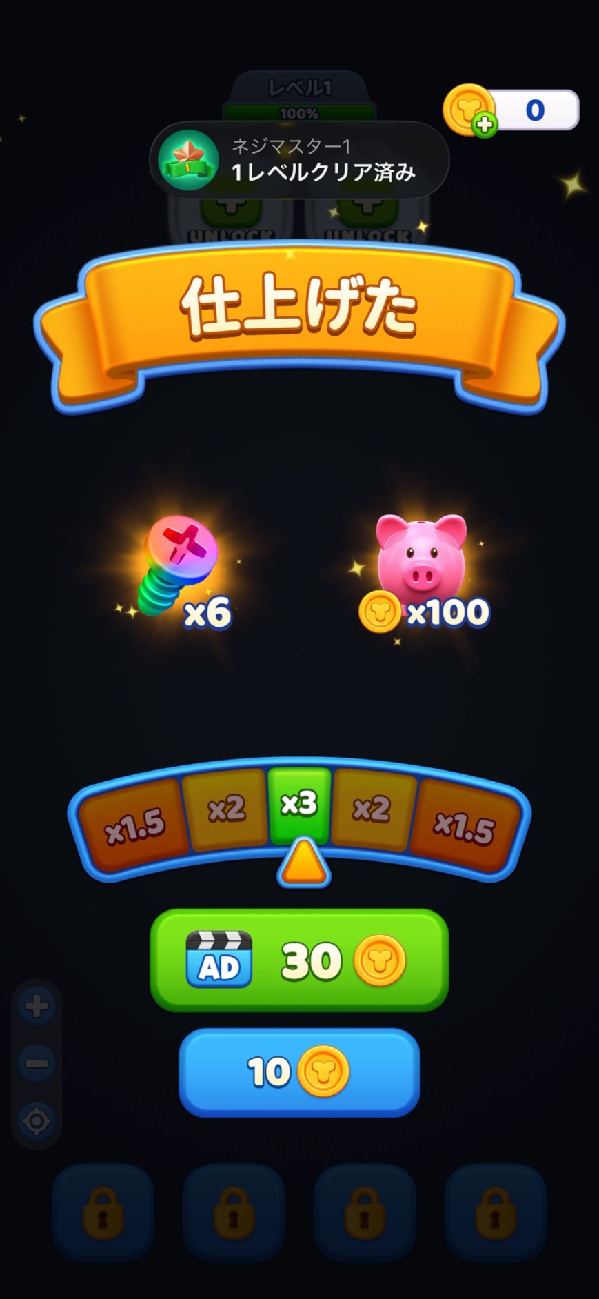 他のネジ外しゲームと違うのは最初からある箱が2箱と少なく、最大でも4個までしか増やせないこと。