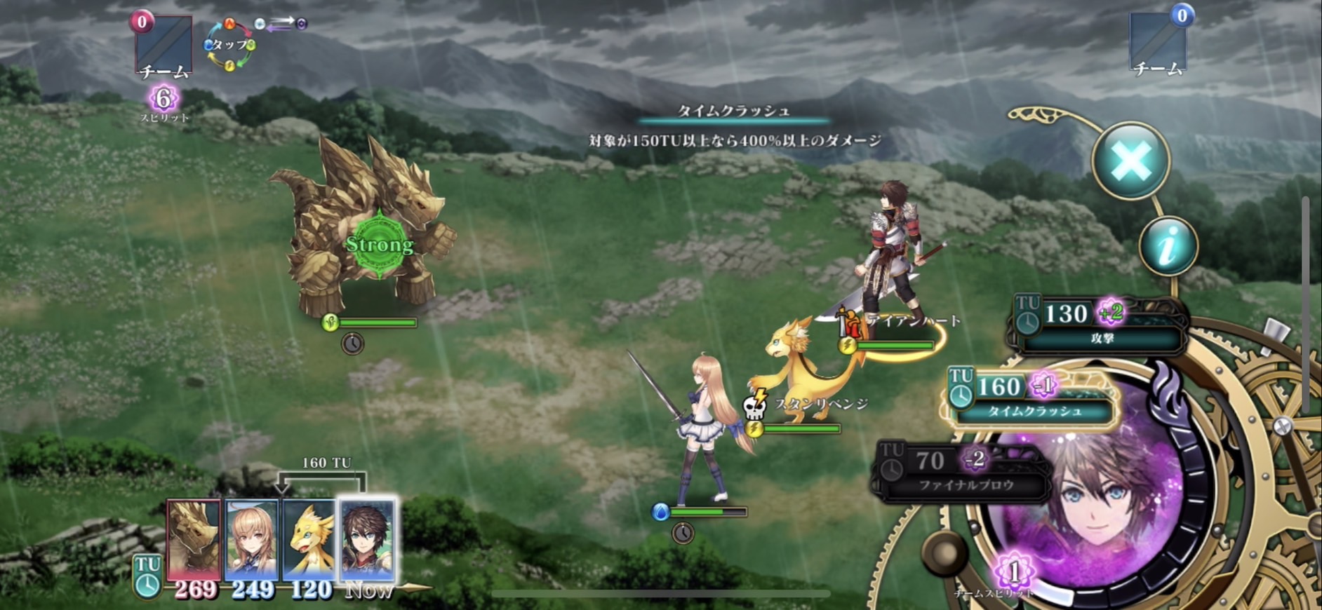 キャラが持つスキルやTU(行動時間)を考えながらバトルする戦略性が高いシステム